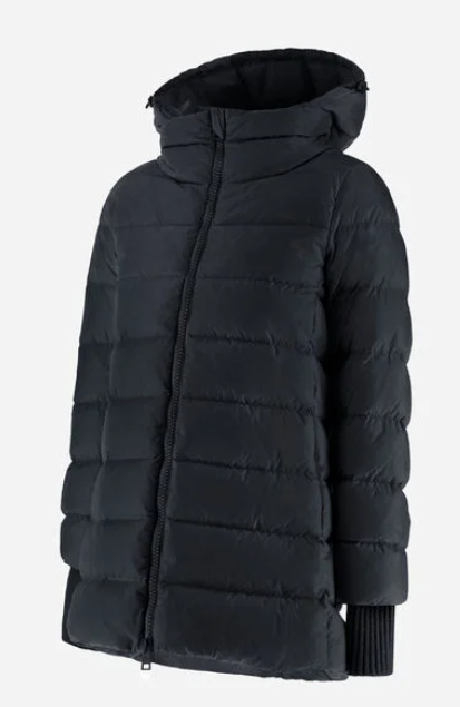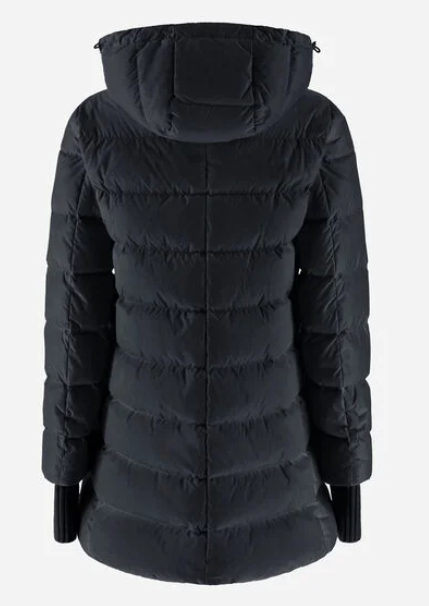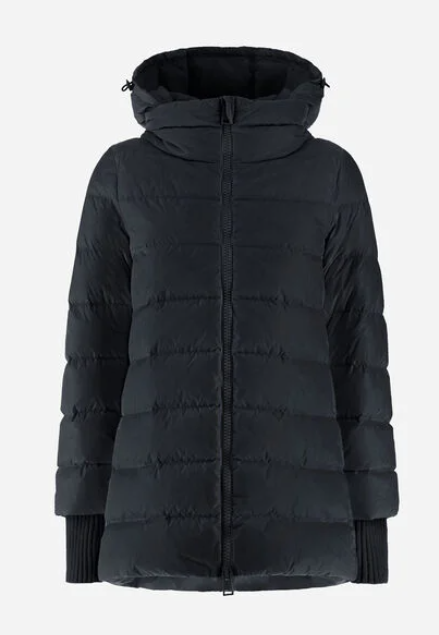 Black A-line jacket made of Chamonix nylon with excellent technical performance from Herno, featuring a down-filled construction and Polartech technology for warmth and wind resistance. It features a detachable hood with a two-way zip, a high collar, zip pockets, and goose down padding.