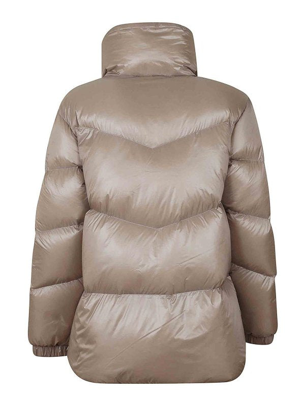 Taupe Down Jacket with high neck collar and botton closure from Woolrich.