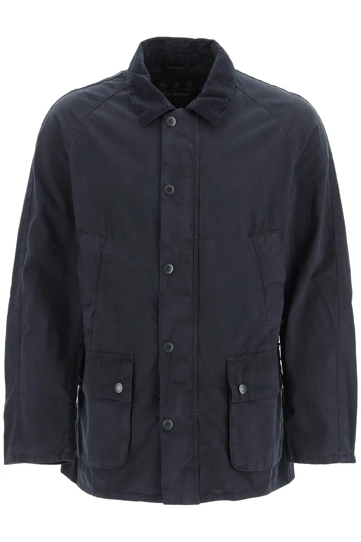 Navy Ashby Jacket from Barbour, concealed full zip fastening, front patch pockets with snap buttons, hand warmer pockets, collar with velvet inner, raglan sleeves.