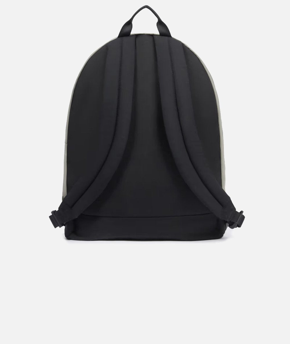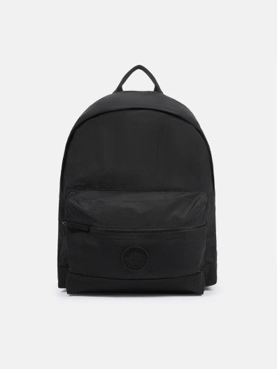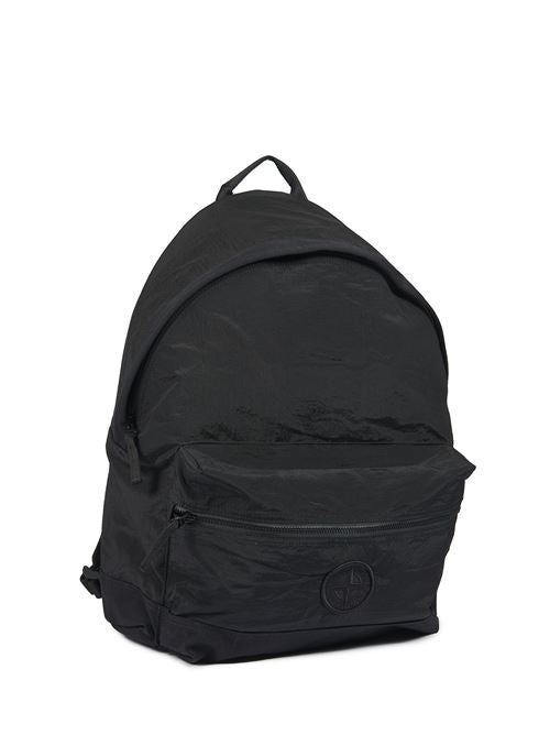 Black backpack in Stone Island's iridescent Nylon Metal, a sustainable fabric by Stone Island. The evolution of this iconic fabric sees the use of ECONYL® regenerated yarns: end-of-life, pre- and post-consumer nylon is recycled with a complex depolymerization process, creating this fiber that has the same intrinsic characteristics as nylon derived from fossil raw materials. Front bellows pocket with horizontal zip closure and embossed Stone Island Compass logo, padded back and reinforced bottom in resistant nylon, internal compartment pocket, zip closure around the top and sides hidden under a tape, padded and adjustable shoulder straps, top handle.