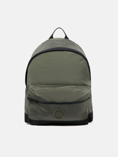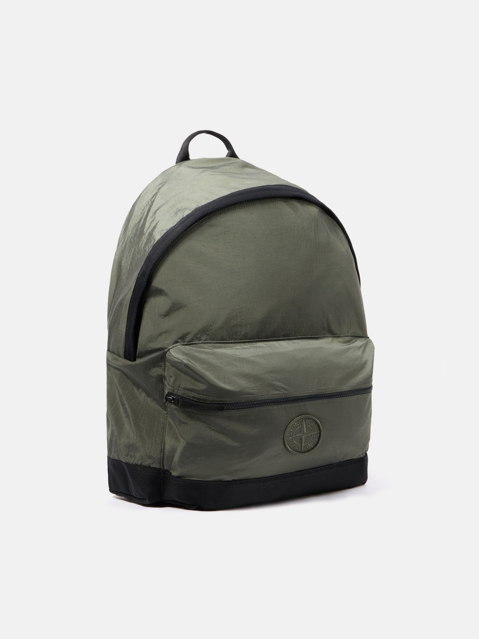 Moss-colored backpack in Stone Island's iridescent Nylon Metal, a sustainable fabric by Stone Island. The evolution of this iconic fabric sees the use of ECONYL® regenerated yarns: end-of-life, pre- and post-consumer nylon is recycled with a complex depolymerization process, creating this fiber that has the same intrinsic characteristics as nylon derived from fossil raw materials. Front bellows pocket with horizontal zip closure and embossed Stone Island Compass logo, padded back and reinforced bottom in resistant nylon, internal compartment pocket, zip closure around the top and sides hidden under a tape, padded and adjustable shoulder straps, top handle.