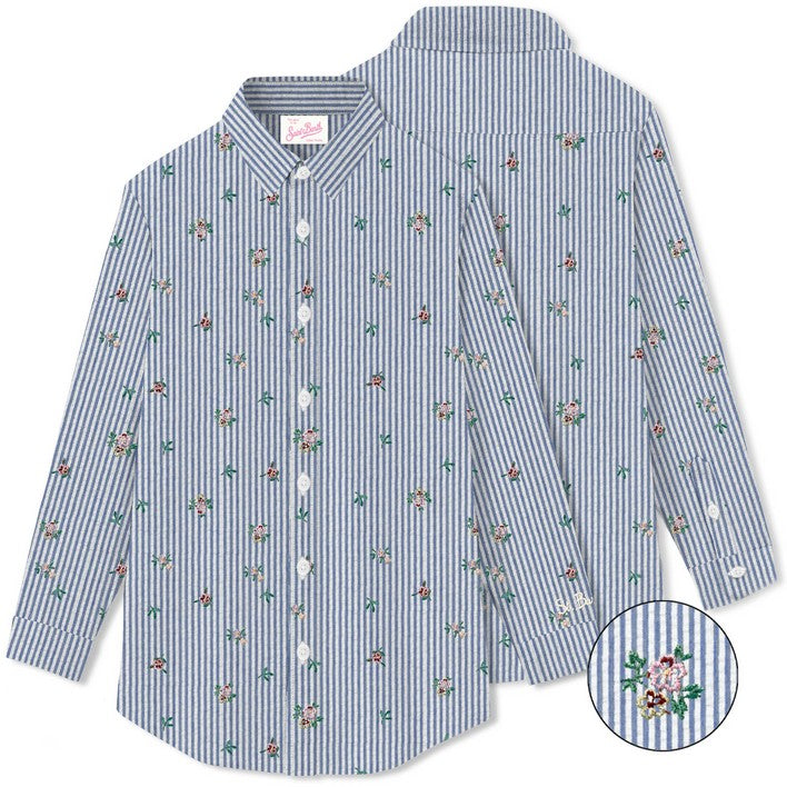 Blue and white striped seersucker shirt with embroidered flowers by Mc2 st.Barth, opening with mother-of-pearl buttons, long sleeves with buttoned cuffs, dropped shoulders, back yoke with pleats on the placket.