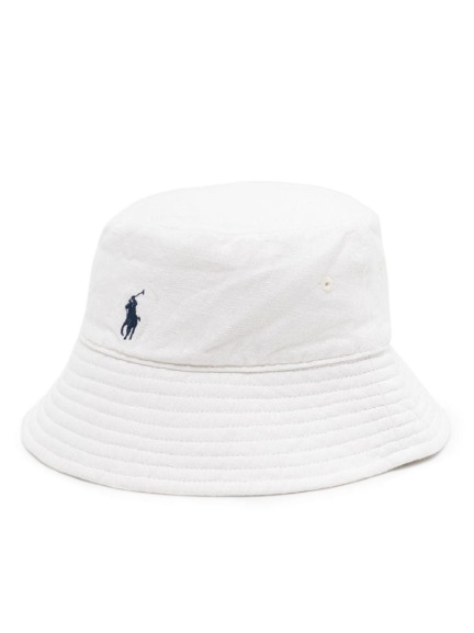 White bucket hat with embroidered logo from Polo Ralph Lauren.