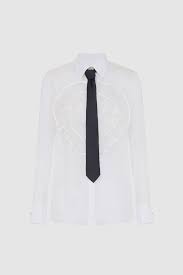 Ivory silk voile shirt from Elisabetta Franchi, long sleeves and regular collar, organza ruffles on the front, contrasting satin tie, first enamel jewel button with chain and gold metal logo, cuffs with cufflinks, hidden closure.