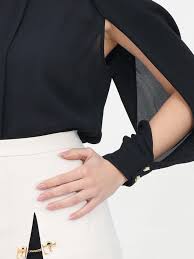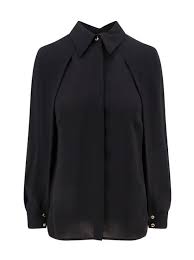 Black shirt in viscose georgette with a loose fit from Elisabetta Franchi. The garment stands out for its cape sleeves, held at the cuffs with gold metal buttons with logo. A final precious touch is given by the crossbody necklace with bow, entirely removable