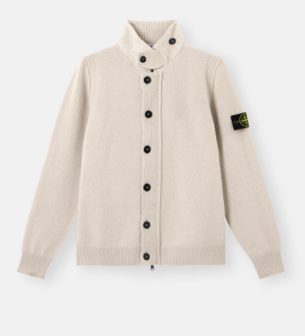 Ivory button-up cardigan in a lambswool and nylon blend from Stone Island, plain knit, gauge 7, stiff ribbed collar lined in felt with a knit tab that can be buttoned around or at the back of the neck, purl-stitch bands on the shoulders and along the armholes, Stone Island badge on the left sleeve, ribbed cuffs and hem, and a two-way zip closure under a felt-lined placket.