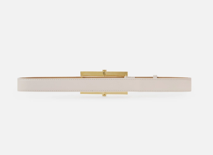 High-waisted milk belt made of synthetic leather-look material by Elisabetta Franchi, with a pin buckle and gold-tone metal logo.