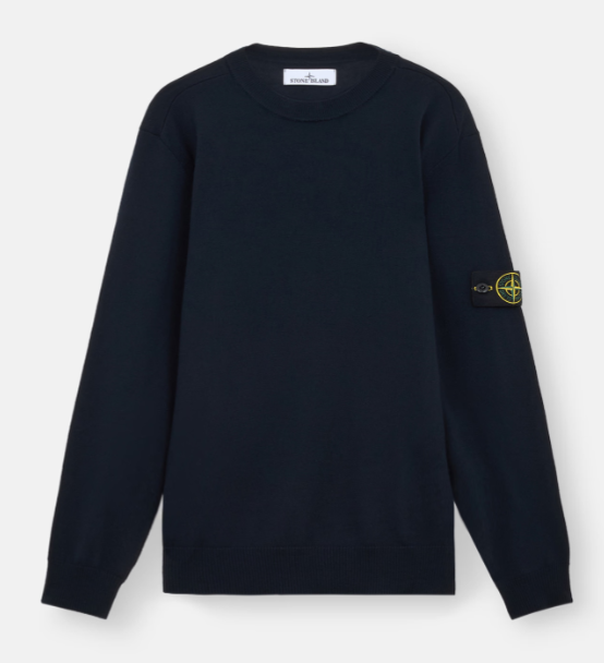 Navy blue crewneck sweater in pure lightweight RWS wool from Stone Island, plain knit. 14 gauge, ribbed neckline with two rows of raised stitching on the back, Stone Island badge on the left sleeve, ribbed cuffs and hem.