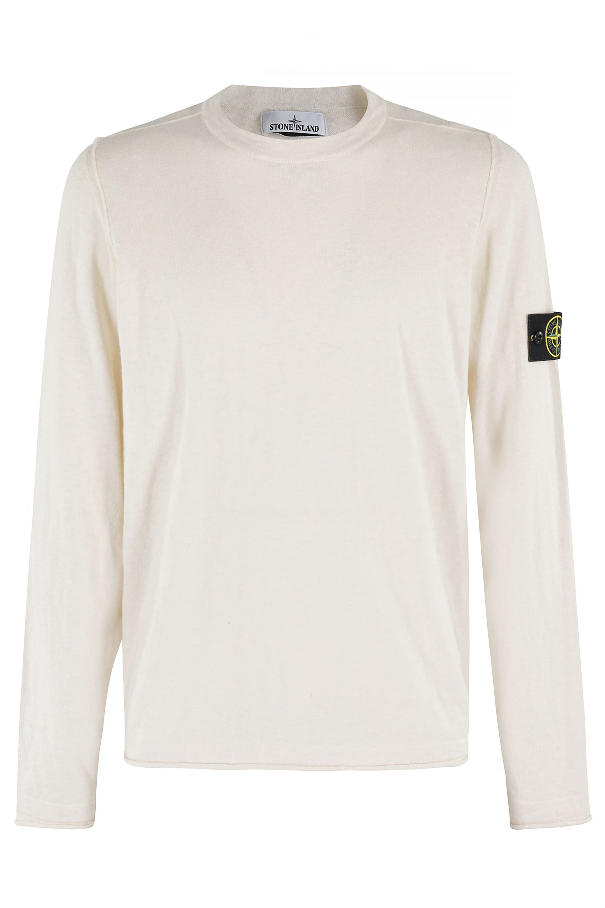 Ivory crewneck sweater in organic cotton and nylon from Stone Island, plain knit, 14 gauge, flat neckline, small turn-up on the armhole, Stone Island badge on the left sleeve, flat bottom band and cuffs with small turn-up.