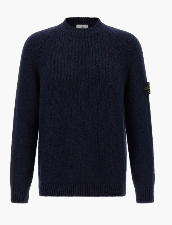 Navy blue Crew-neck sweater in a mouliné wool and nylon blend. Plain knit. Gauge 3. Ribbed neckline. Raglan sleeves. Stone Island badge on the left sleeve. Ribbed cuffs and hem.
