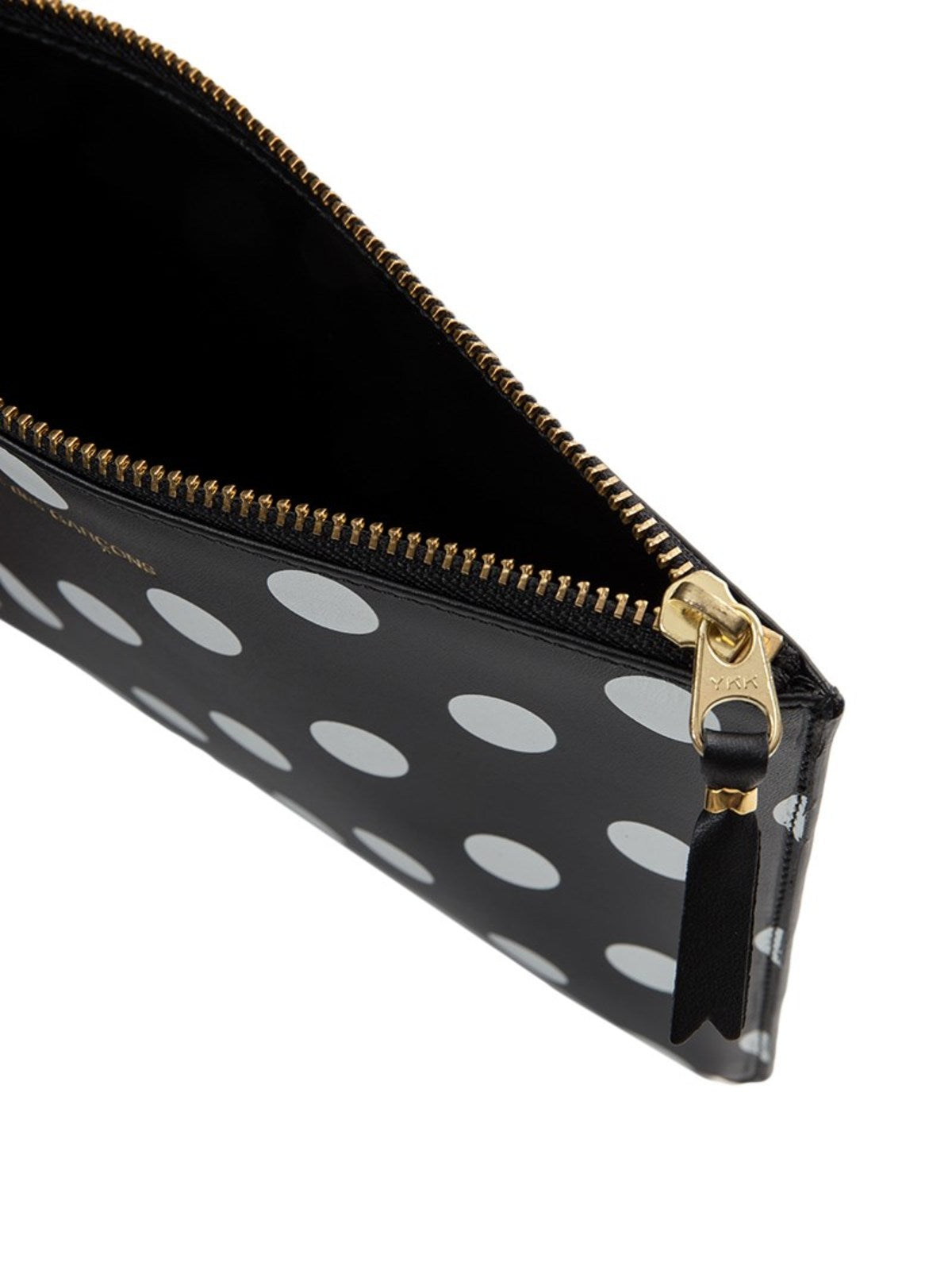 Black with contrasting white polka dots wallet from Comme des Garcons Wallet, gold zip closure and gold logo printed on the front.