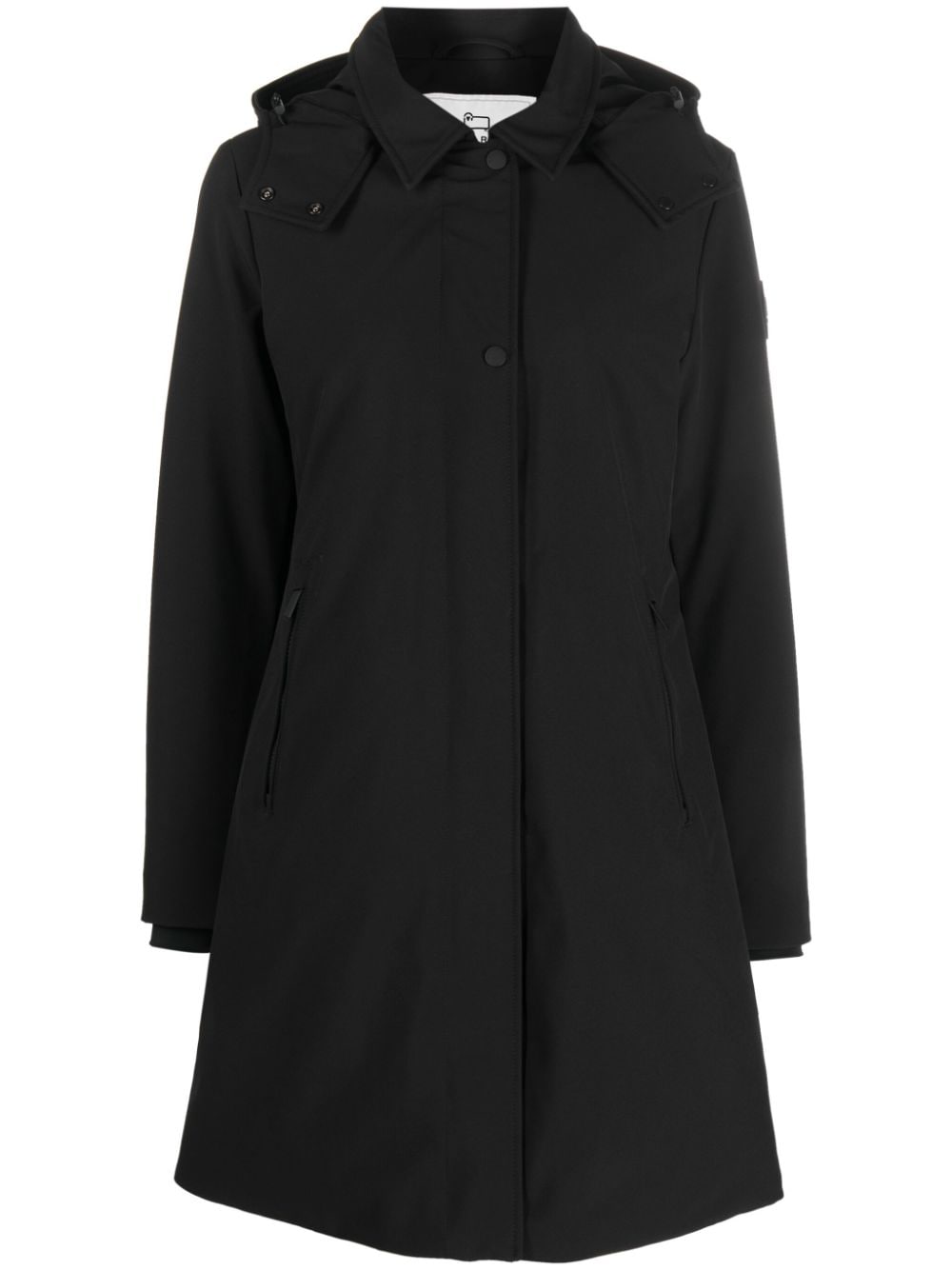 Long black jacket in soft shell fabric with removable hood and botton closure from Woolrich.