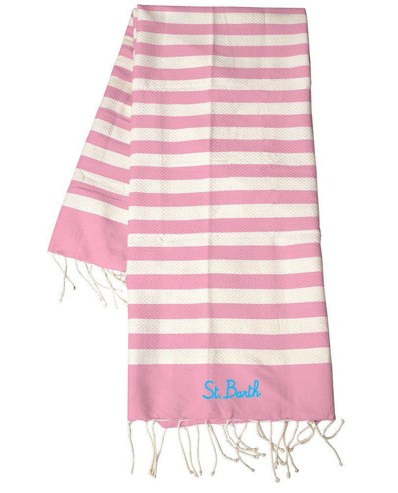 Fouta beach towel in cotton by Mc2 St.Barth, pink and white striped print, embroidered St. Barth logo, fringed hem