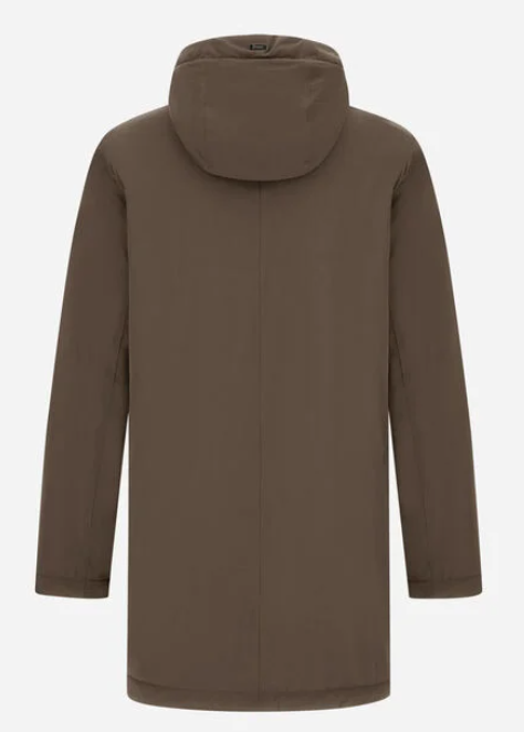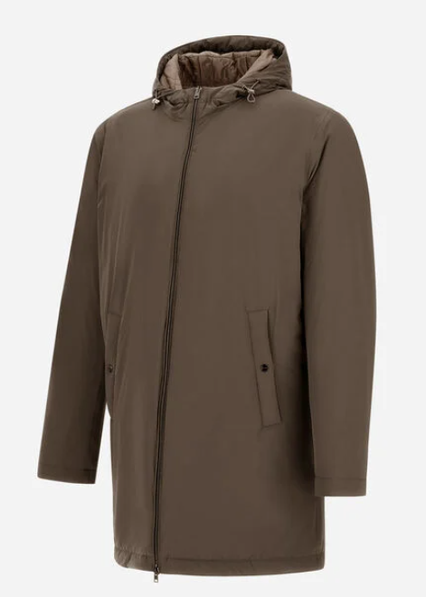 Herno's dove gray parka is crafted from a 30-denier nylon yarn wrapped around and covering a 20-denier elastane yarn in both the weft and warp. The result is a 4-way stretch texture.