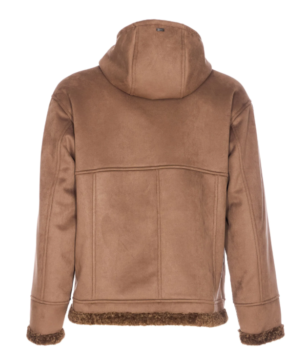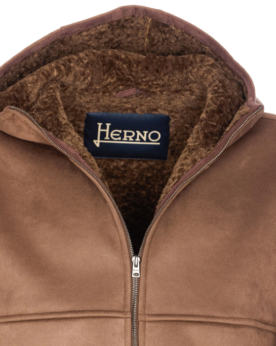 Brown Herno jacket, crafted from soft faux suede and featuring a warm faux shearling lining. The design includes a built-in hood and a full-length two-way zip for optimal protection, along with side pockets.