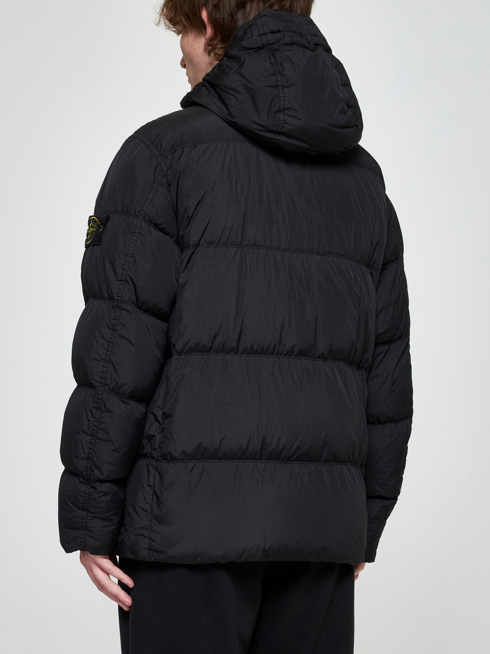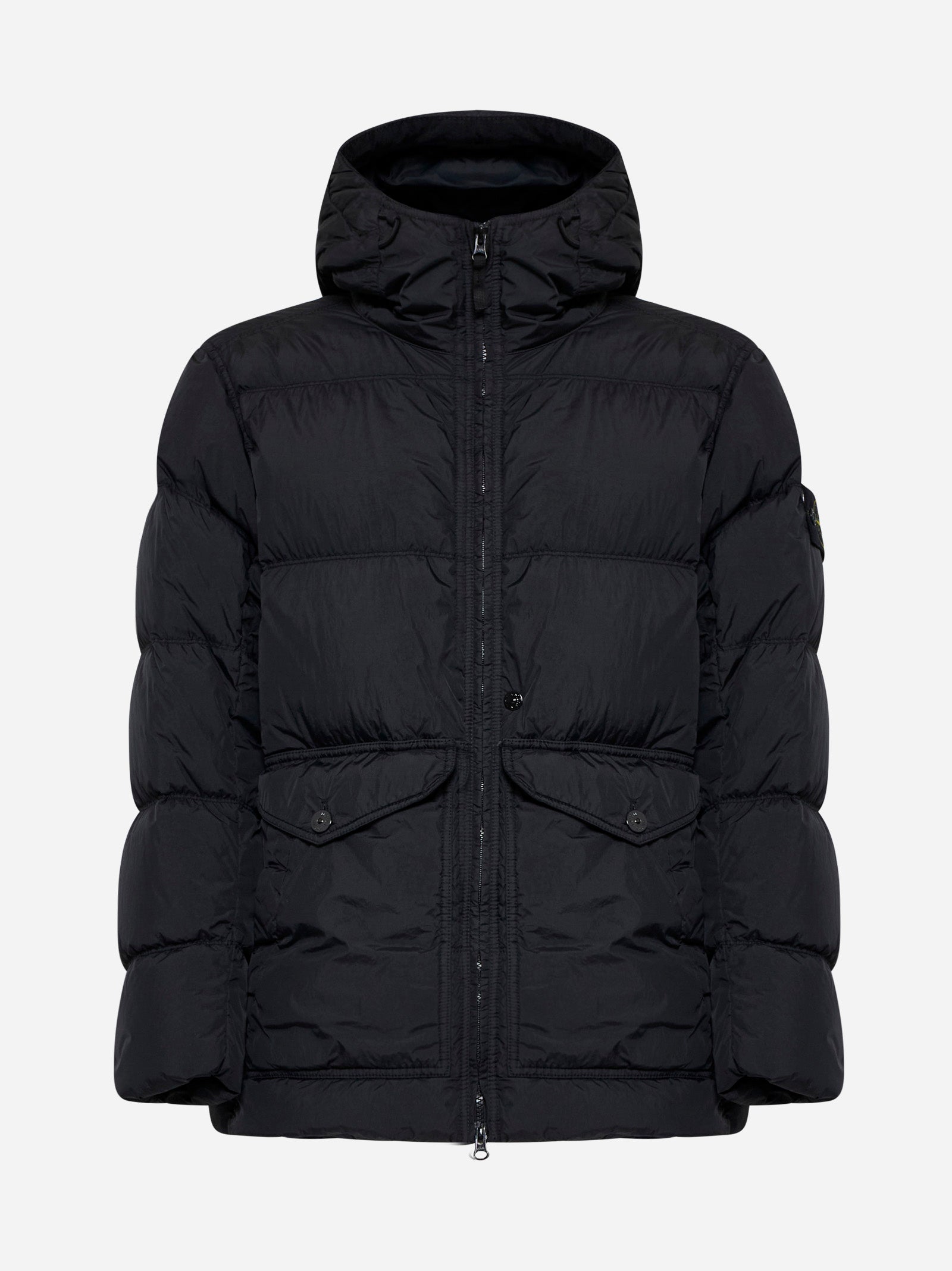 Black down jacket with hood, two frontal pockets and zip closure from Stone Island.