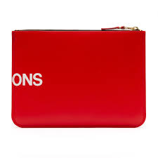 Red wallet from Comme des Garcons Wallet, in leather, gold zip closure, contrasting logo printed in the centre.