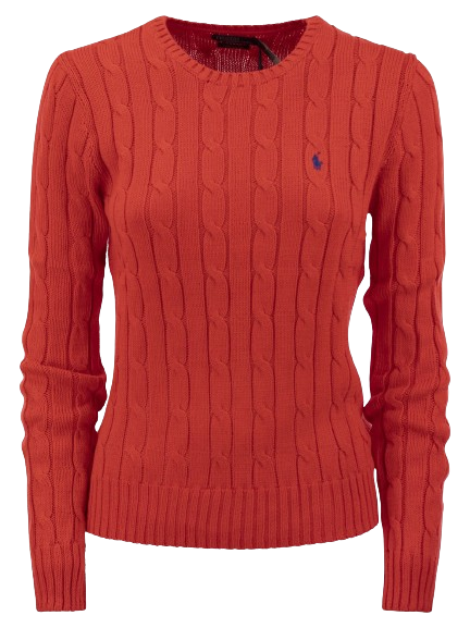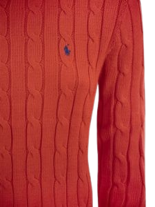Red round neck cable sweater with small embroidered logo from Polo Ralph Lauren.