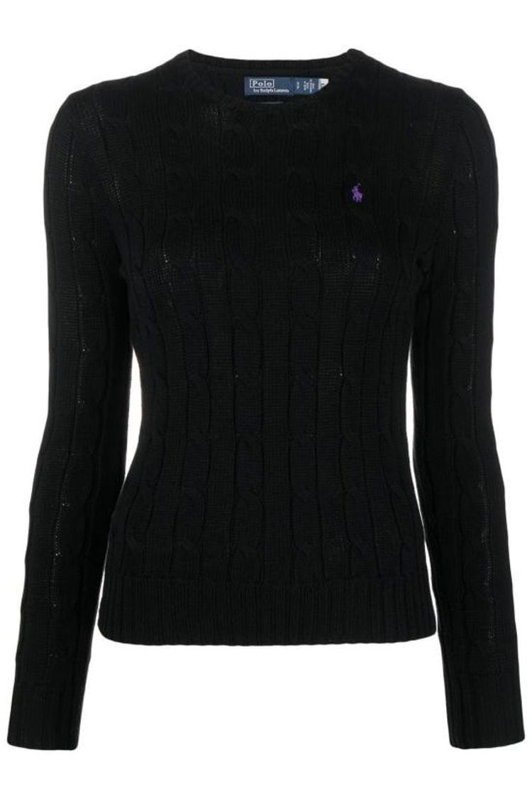 Black round neck cable sweater with small embroidered logo from Polo Ralph Lauren.