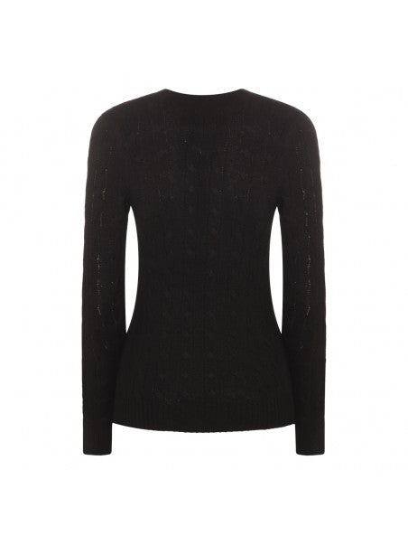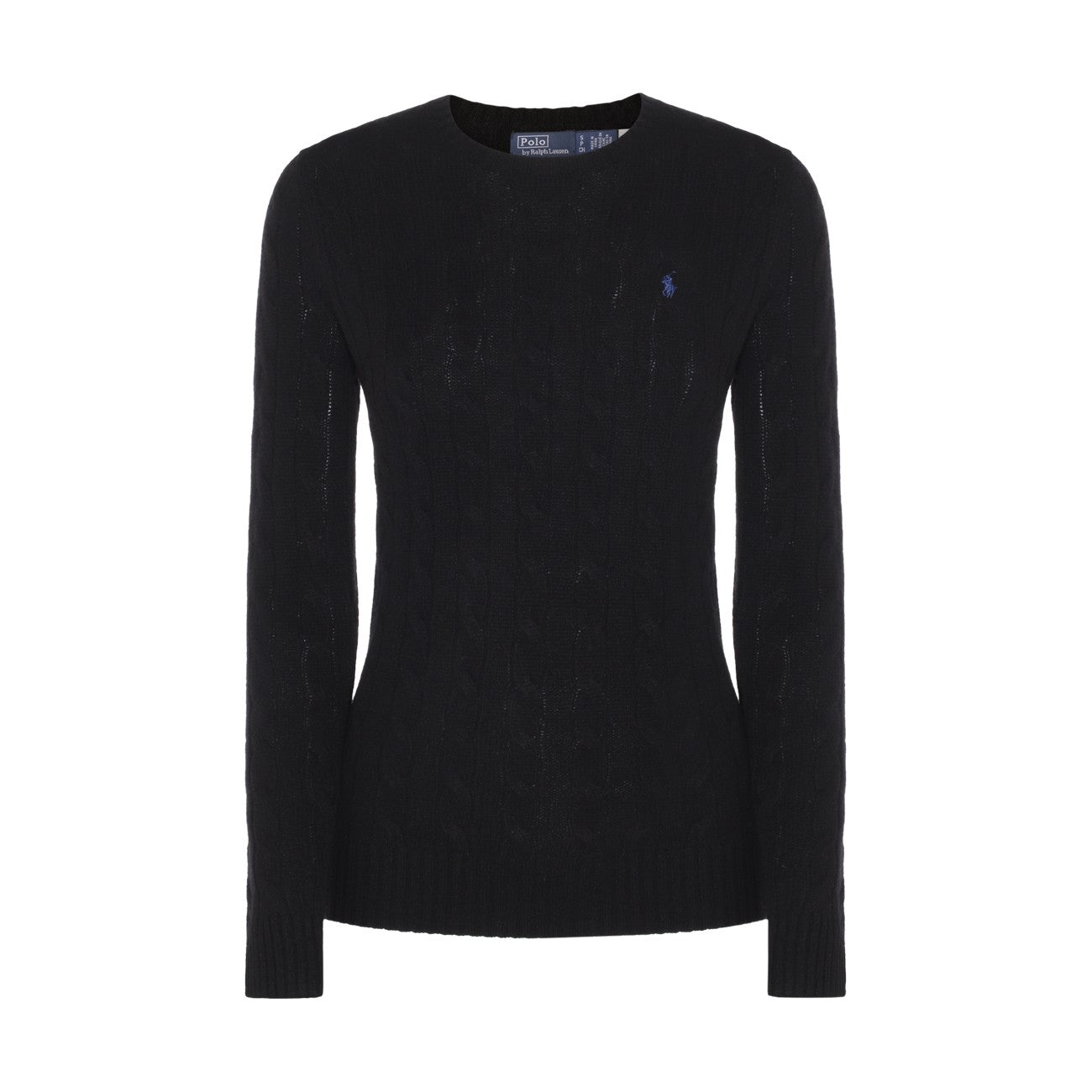 Black crew neck sweater with,long sleeves, embroidered logo on the chest and braid work from Polo Ralph Lauren.