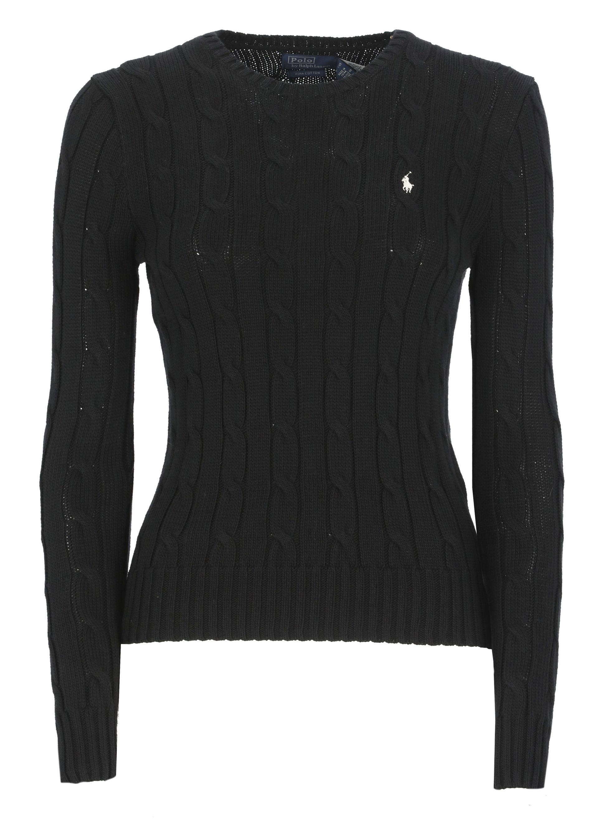 Black crew neck cable knit sweater from Polo Ralph Lauren, long sleeves with ribbed cuffs, ribbed hem, signature embroidered pony on the left chest.