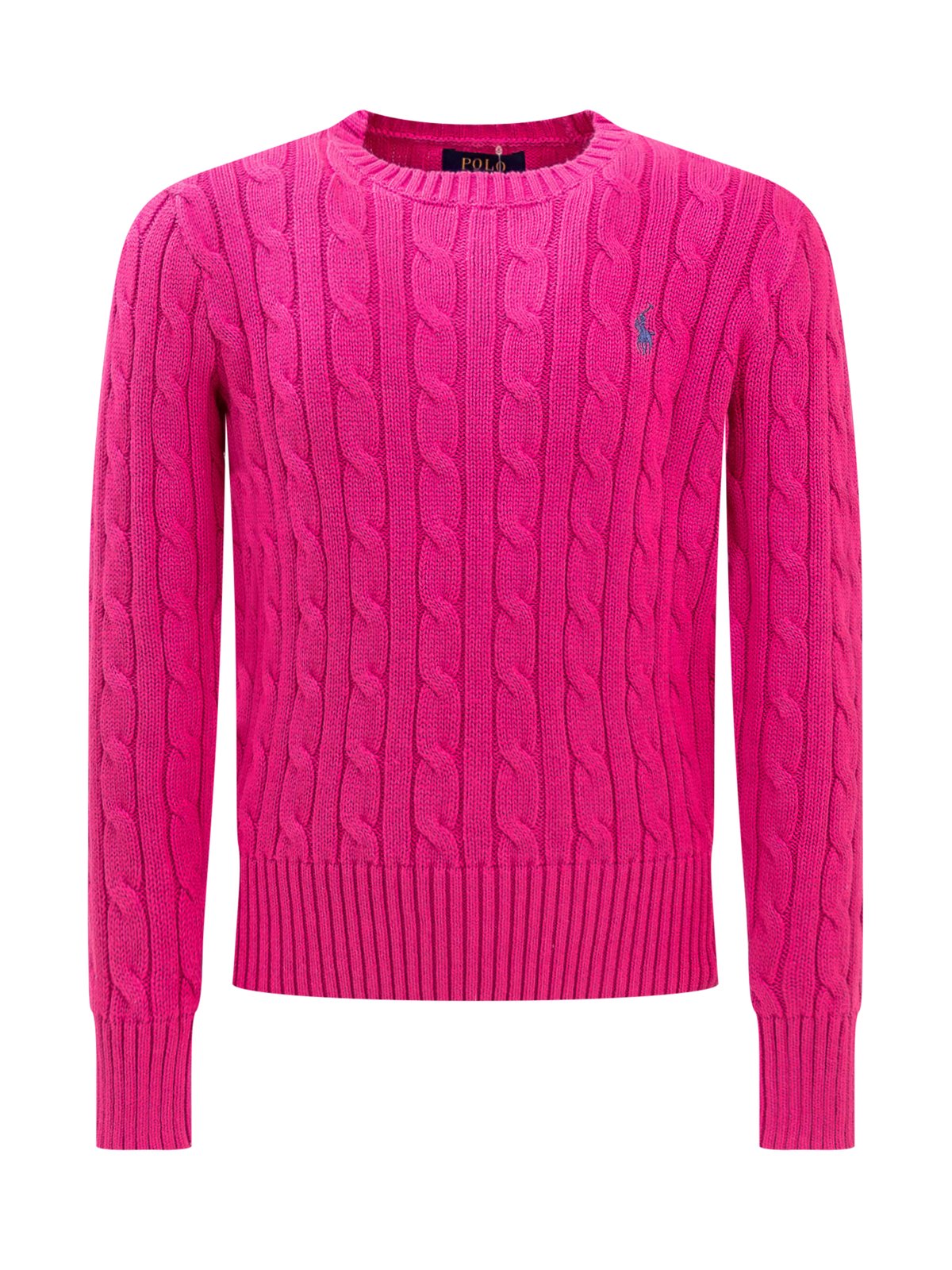 Regatta pink crew neck cable knit sweater from Polo Ralph Lauren, long sleeves with ribbed cuffs, ribbed hem, signature embroidered pony on the left chest.
