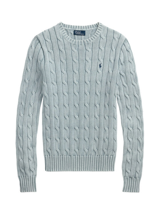 Light Chambray crew neck cable knit sweater from Polo Ralph Lauren, long sleeves with ribbed cuffs, ribbed hem, signature embroidered pony on the left chest.