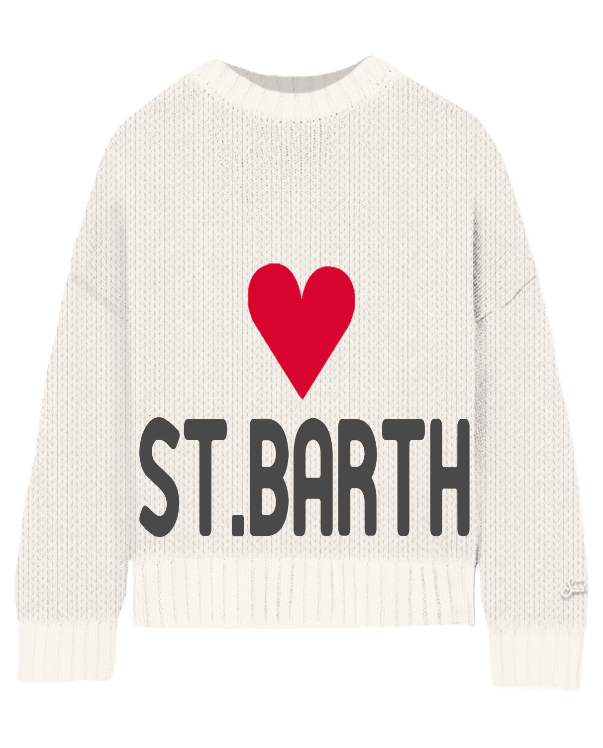 White crewneck sweater by St. Barth, long sleeves, ribbed collar, cuffs, and hem, St. Barth logo embroidery on the cuff, red heart, and ST.BARTH lettering intarsia on the front.