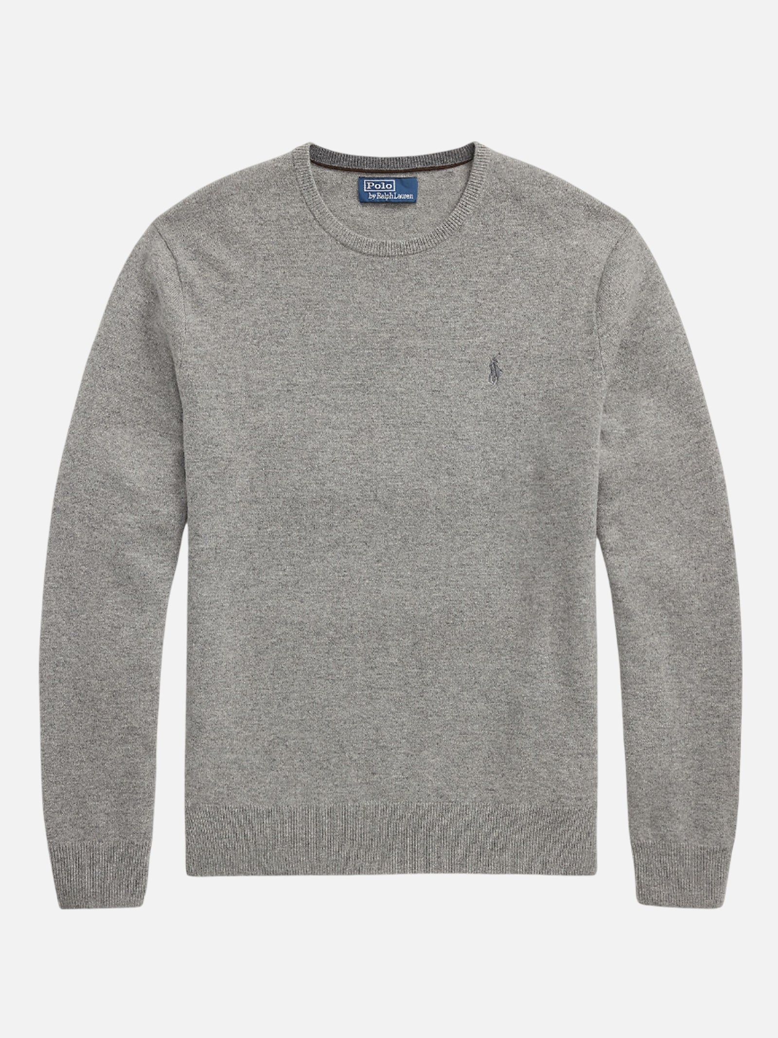 Fawn grey heather crewneck sweater by Polo Ralph Lauren, long sleeves, ribbed cuffs and hem, and embroidered pony on the chest.