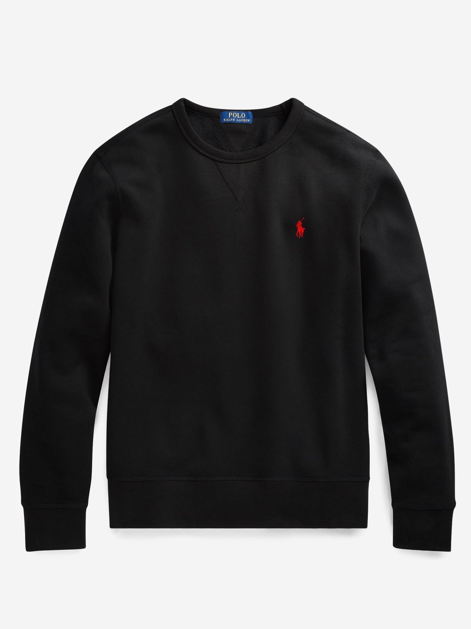 Black crewneck sweatshirt by Polo Ralph Lauren, long sleeves, ribbed cuffs and hem, embroidered pony on the chest