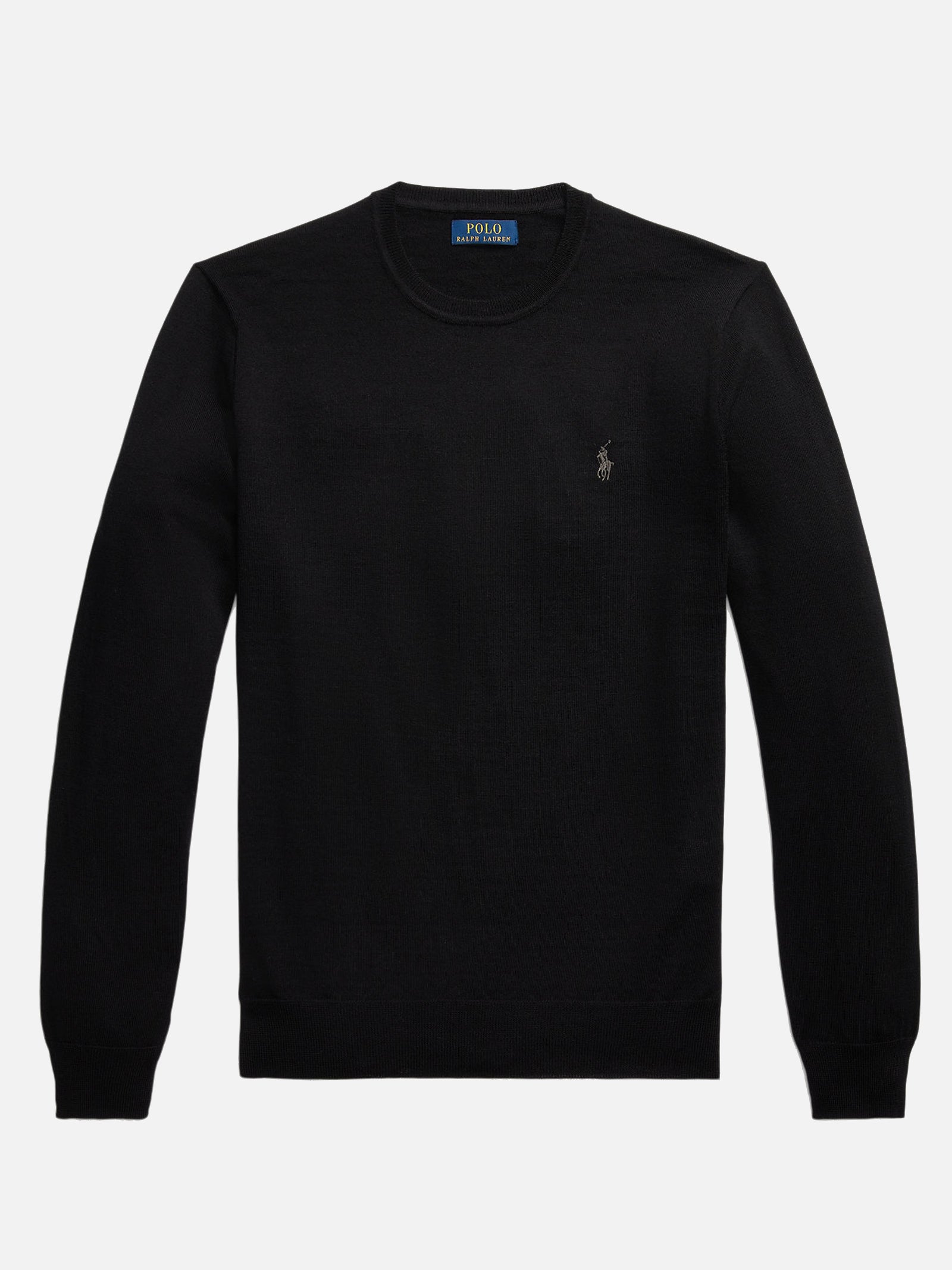 Black crewneck sweater by Polo Ralph Lauren, long sleeves, ribbed cuffs and hem, and embroidered pony on the chest.