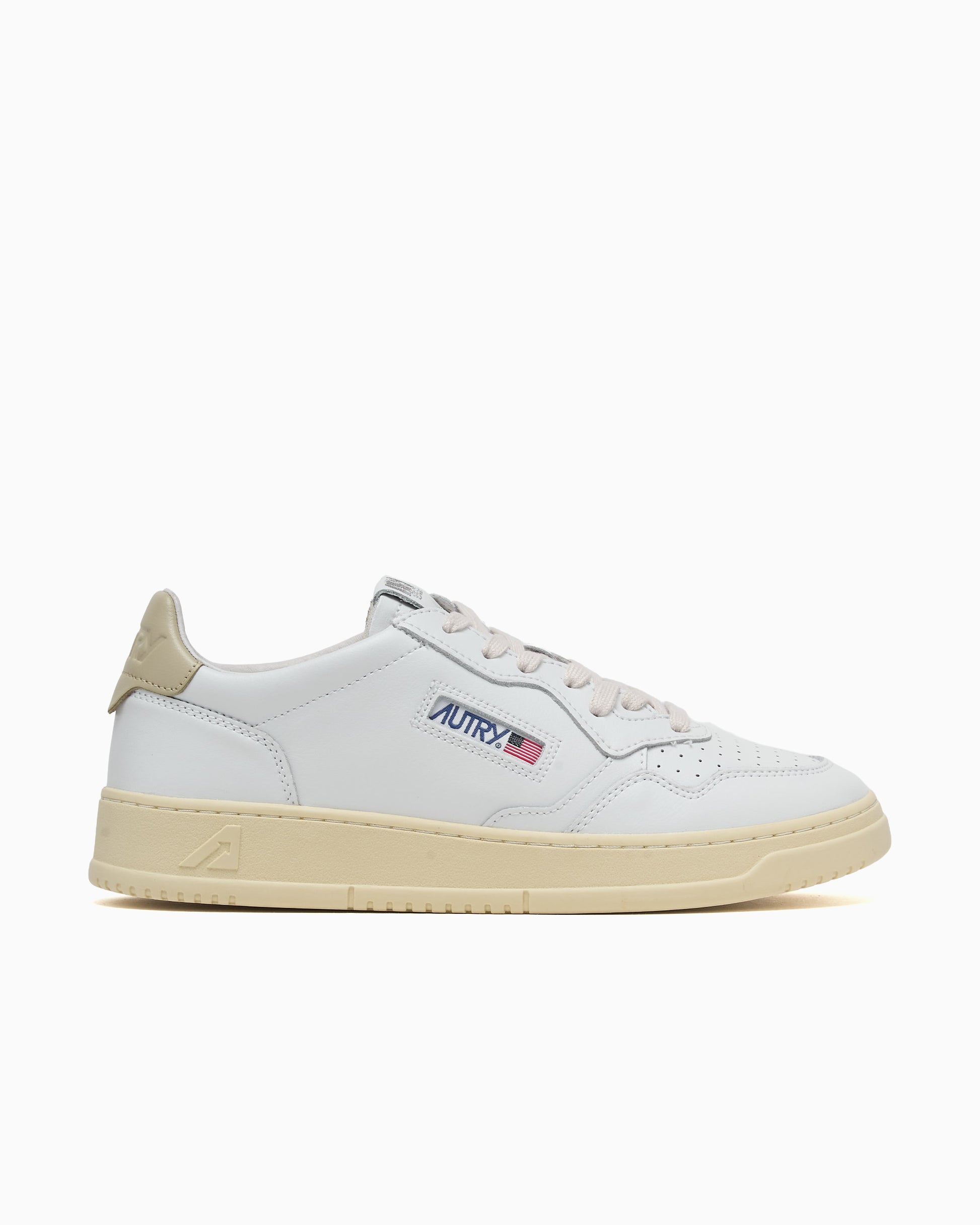 White sneakers by Autry with cream detailing, a round toe with ventilation holes, cotton laces, a logo on the tongue, a side logo tag, a padded collar, a leather and cotton terry lining, a leather insole with a 2 cm logo, and a 4 cm used-look rubber sole. Comes with a dust bag.