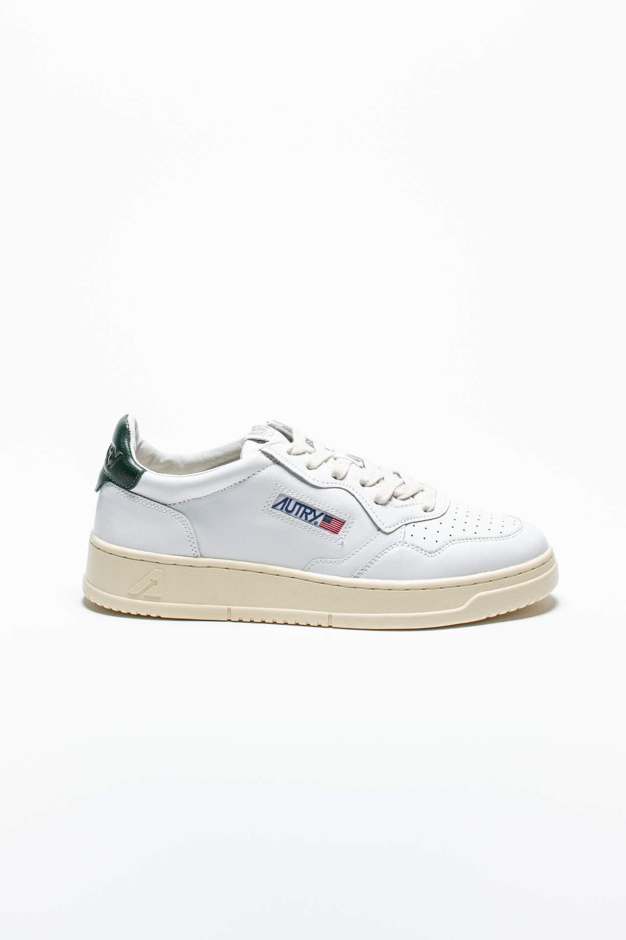 White sneakers by Autry with mountain green detailing, a round toe with ventilation holes, cotton laces, a logo on the tongue, a side logo tag, a padded collar, a leather and cotton terry lining, a leather insole with a 2 cm logo, and a 4 cm used-look rubber sole. Comes with a dust bag.
