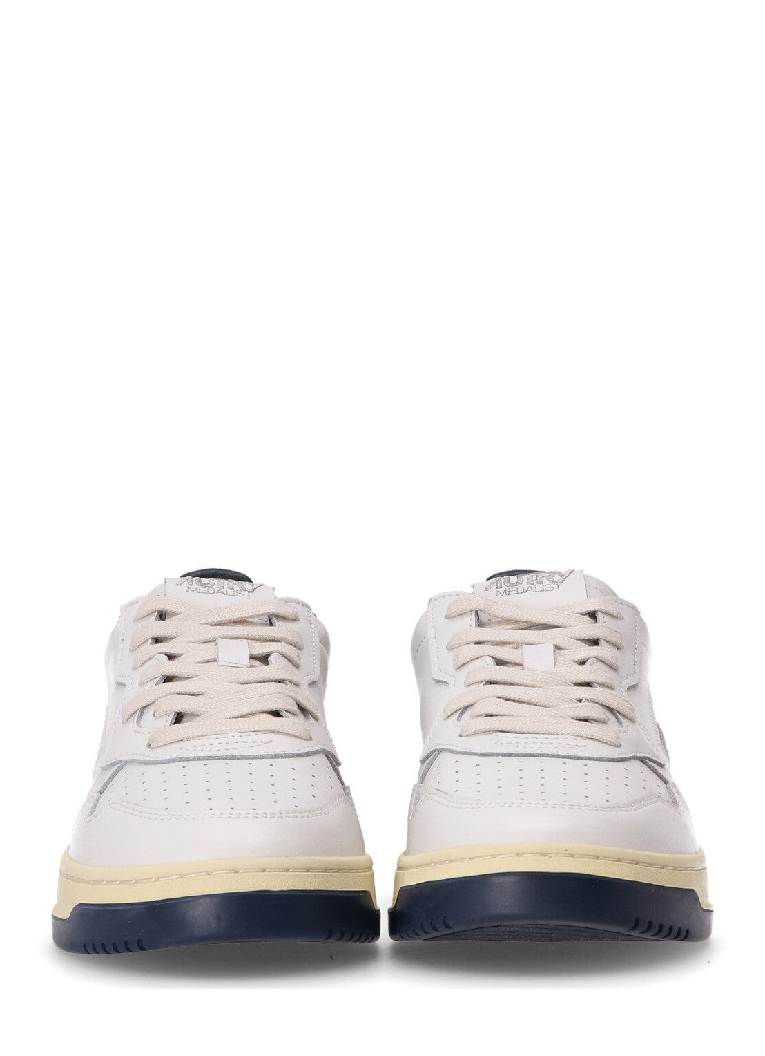 White sneakers with navy details by Autry in collaboration with Maison Kitsune, round toe with perforations for breathability, cotton laces, logo on the tongue, side logo label, padded collar, leather and cotton terry lining, leather insole with 2 cm logo, 4 cm used-effect rubber sole. Case included.