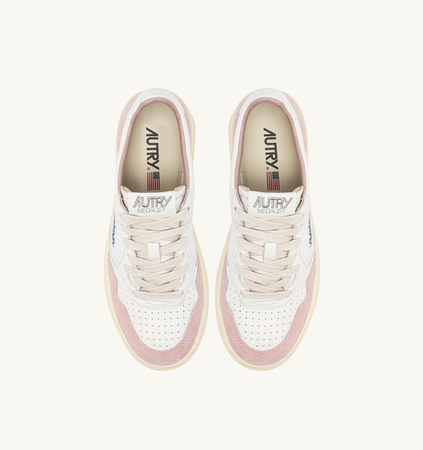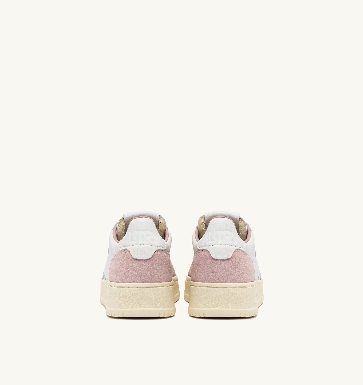 White and powder sneakers from Autry, with suede insert, round toe with holes for breathability, cotton laces, logo on the tongue, side logo label, padded collar, leather and cotton sponge lining, 2 cm logoed leather insole, 4 cm used effect rubber sole. Case included.