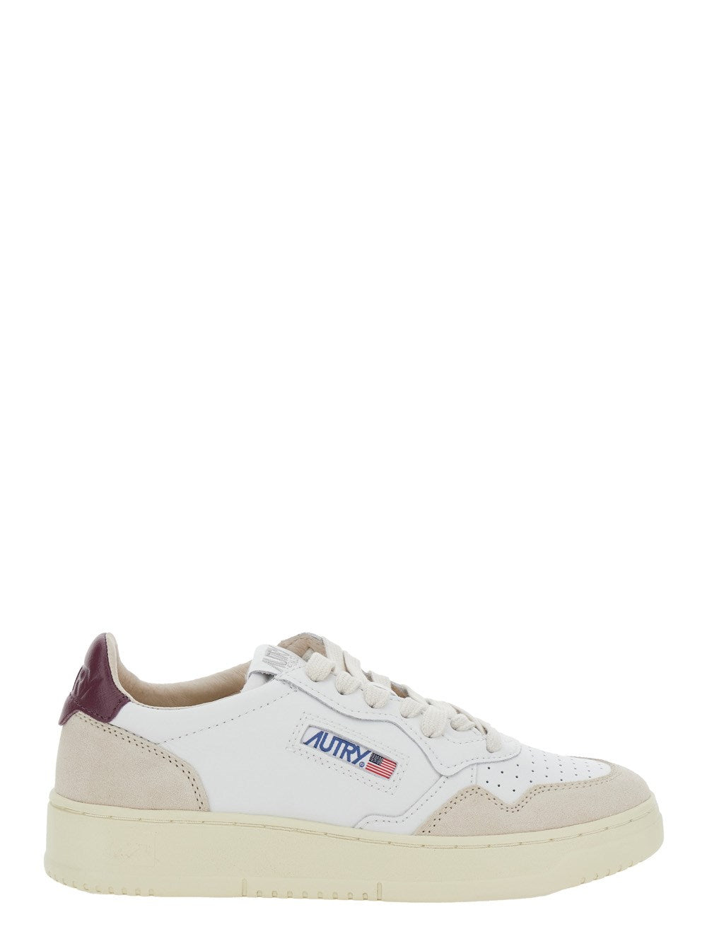 White and burgundy sneakers from Autry, round toe with holes for breathability, cotton laces, logo on the tongue, side logo label, padded collar, leather and cotton sponge lining, 2 cm logoed leather insole, 4 cm used effect rubber sole. Case included.