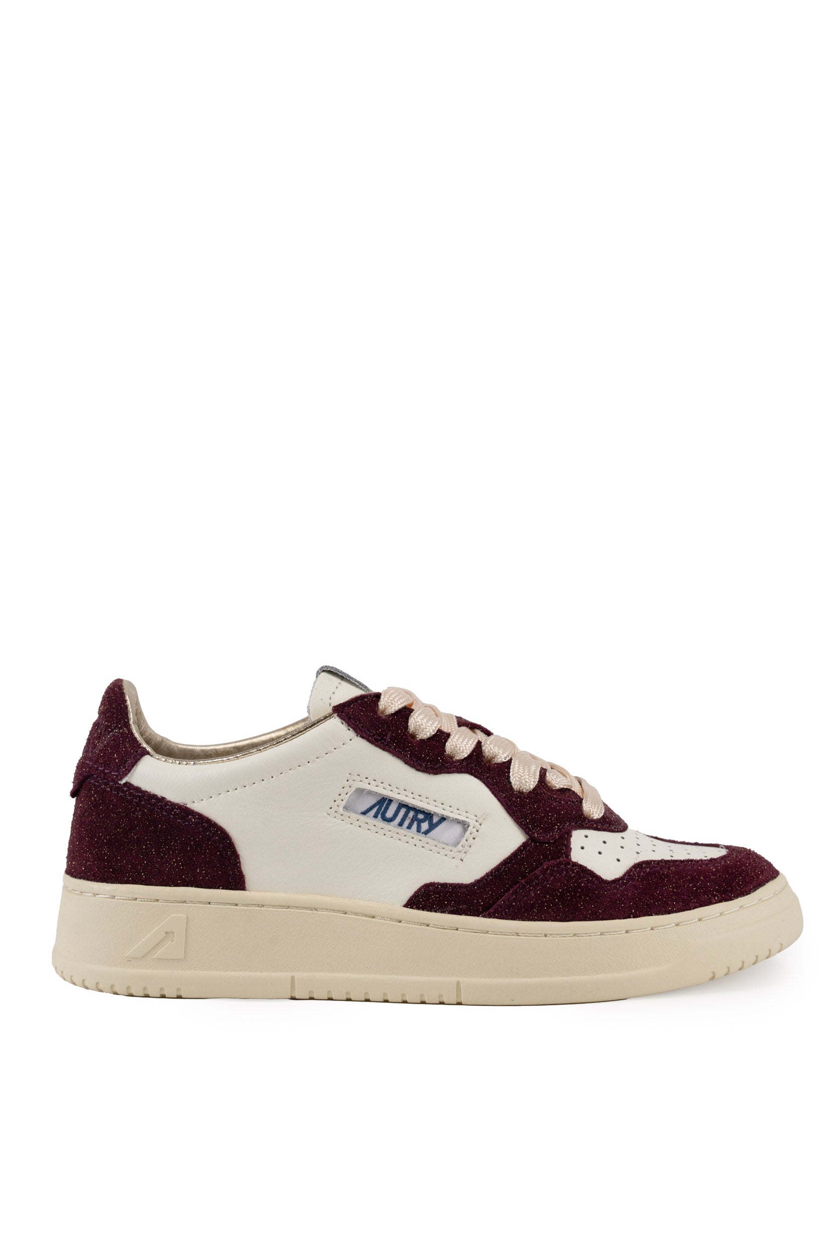 Autry's white and bordeaux Medalist sneaker in white leather features sand suede panels with glitter, a perforated toe cap, flat cotton laces, an embroidered label sewn onto the tongue, a leather and cotton terry lining, a 2 cm raised leather insole, and a rubber outsole.