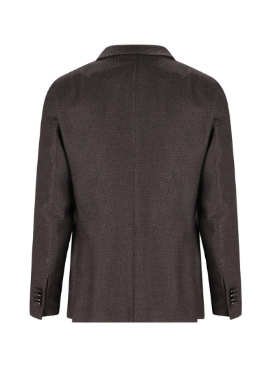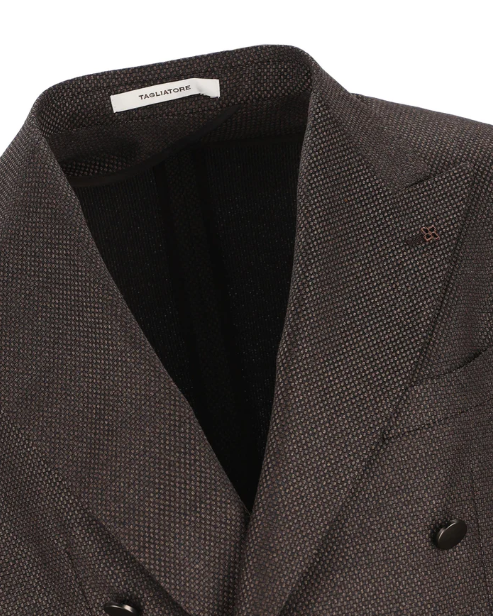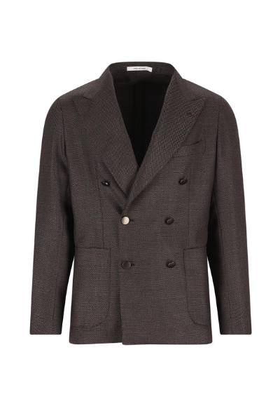 Tagliatore's brown double-breasted jacket, crafted from virgin wool, features a soft, unstructured fit with peak lapels, patch pockets, and a chest pocket. It features a flowing silhouette and a double-breasted six-button closure.