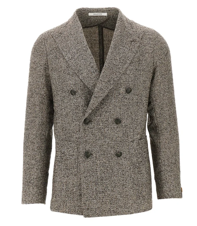 Tagliatore jacket in shades of brown made of a virgin wool blend tweed with a mouliné effect. Double-breasted, peak lapels, side patch pockets, a welt chest pocket, buttoned cuffs, and side vents on the back. Unlined body and cupro-lined sleeves.
