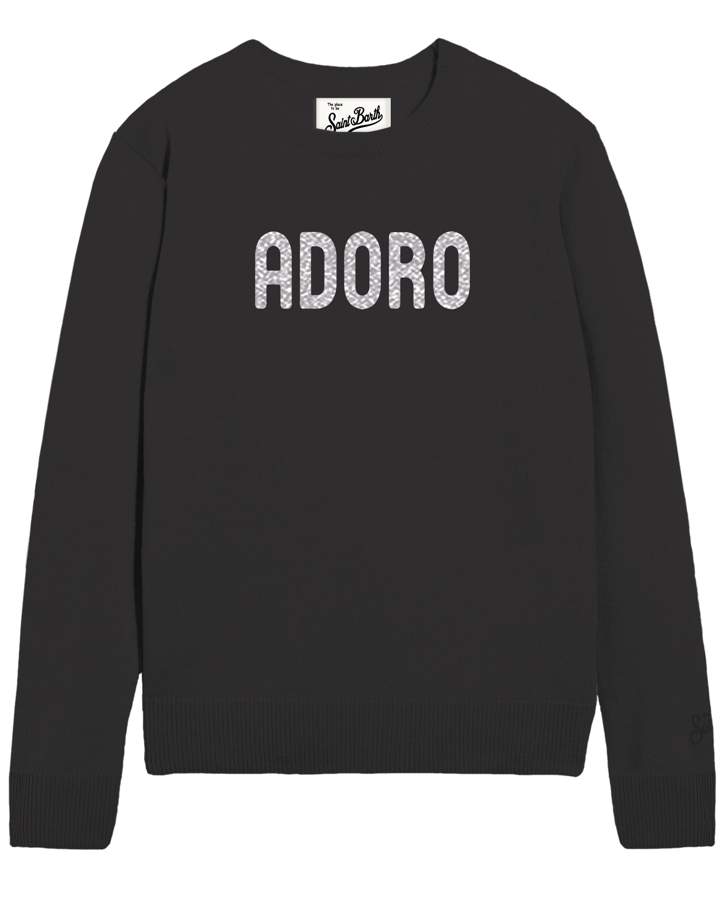 Black crewneck sweater by St. Barth, long sleeves, ribbed collar, cuffs, and hem, St. Barth logo embroidery on the cuff, and silver jacquard "Adoro" print on the front.