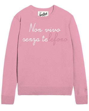Pink crewneck sweater by St. Barth, long sleeves, ribbed collar, cuffs, and hem, St. Barth logo embroidery on the cuff, and "I can't live without television" relief embroidery on the front.