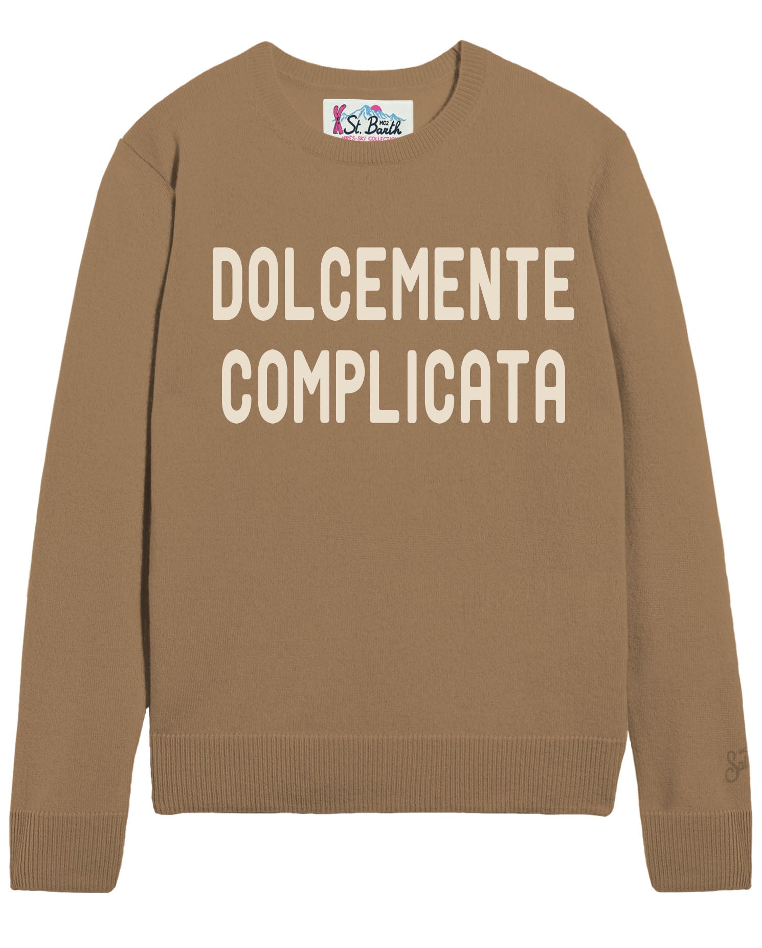 Camel crewneck sweater by St. Barth, long sleeves, ribbed collar, cuffs, and hem, St. Barth logo embroidery on the cuff, and white jacquard "Dolcemente complicata" print on the front.