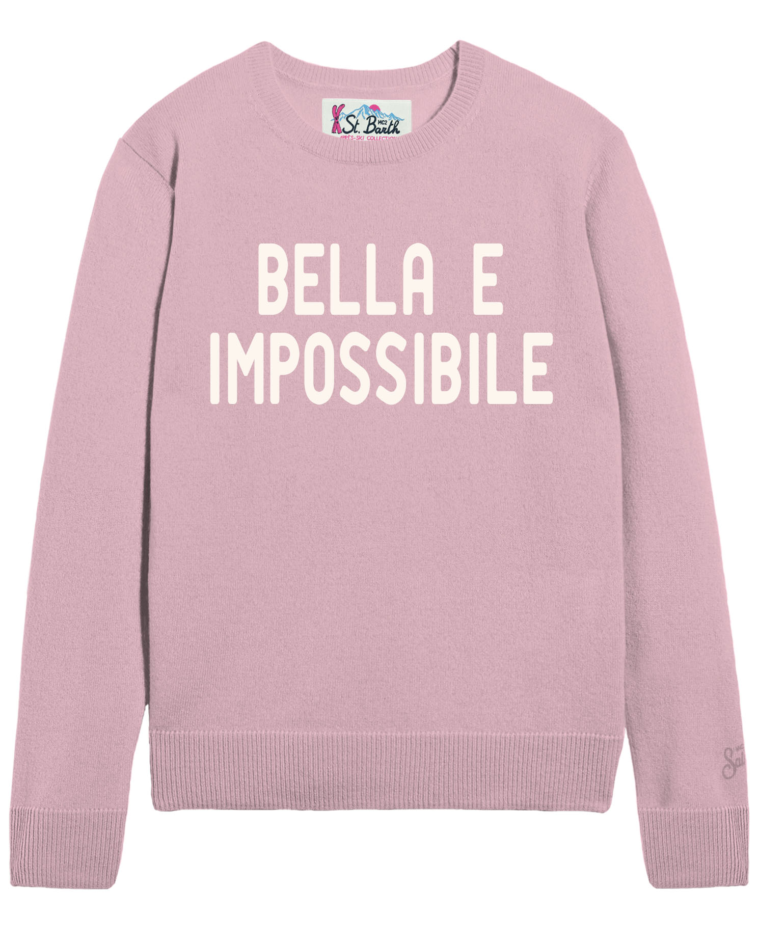 Pink crewneck sweater by St. Barth, long sleeves, ribbed collar, cuffs, and hem, St. Barth logo embroidery on the cuff, and white jacquard "Bella e impossibile" print on the front.