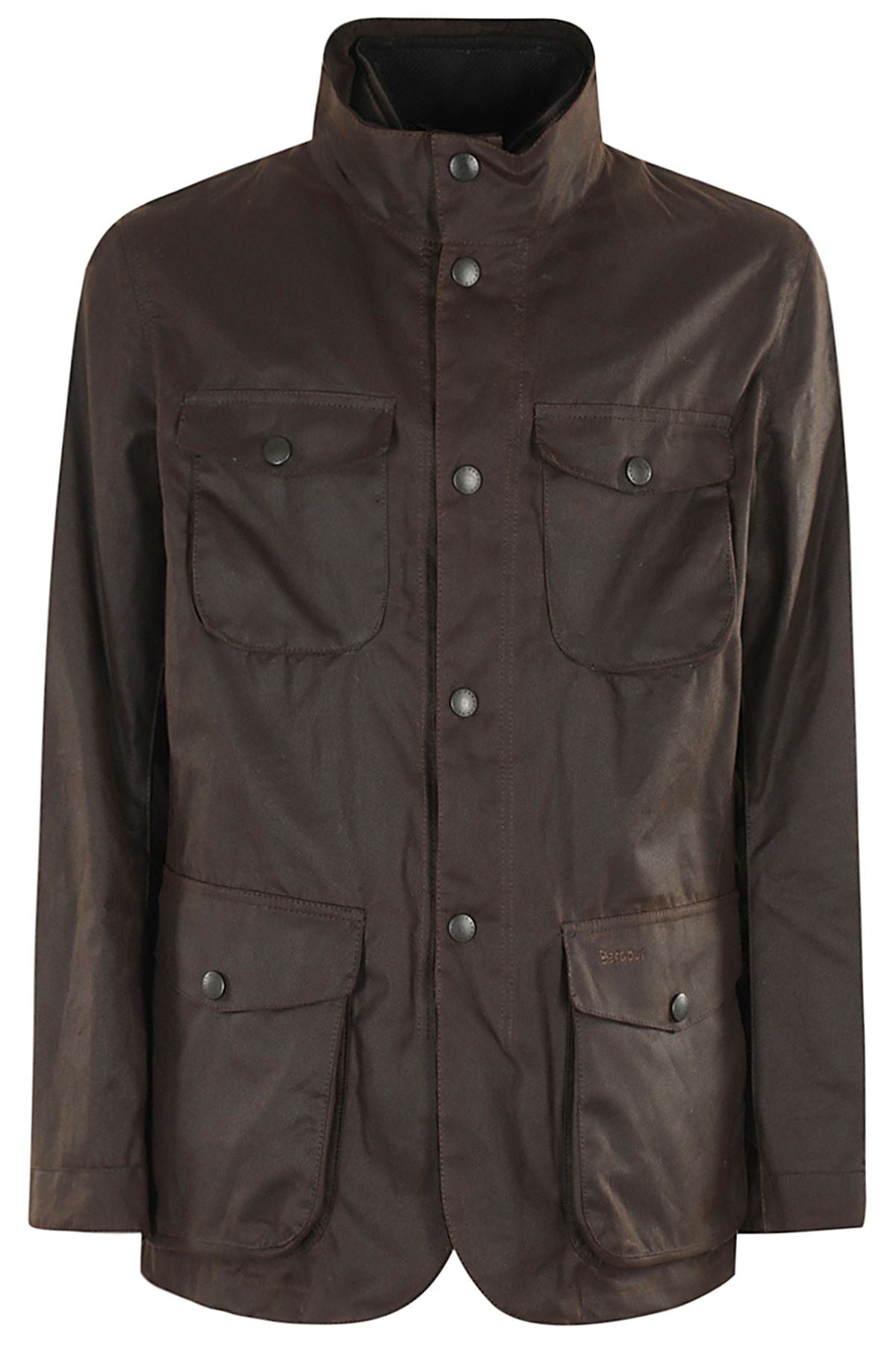 Rustic Ogston wax jacket from Barbour, tartan-patterned cotton lining, green nylon diamond insert, brown corduroy collar and placket. Front button pockets and brown leather elbow reinforcements. Zip closure covered by a buttoned flap.