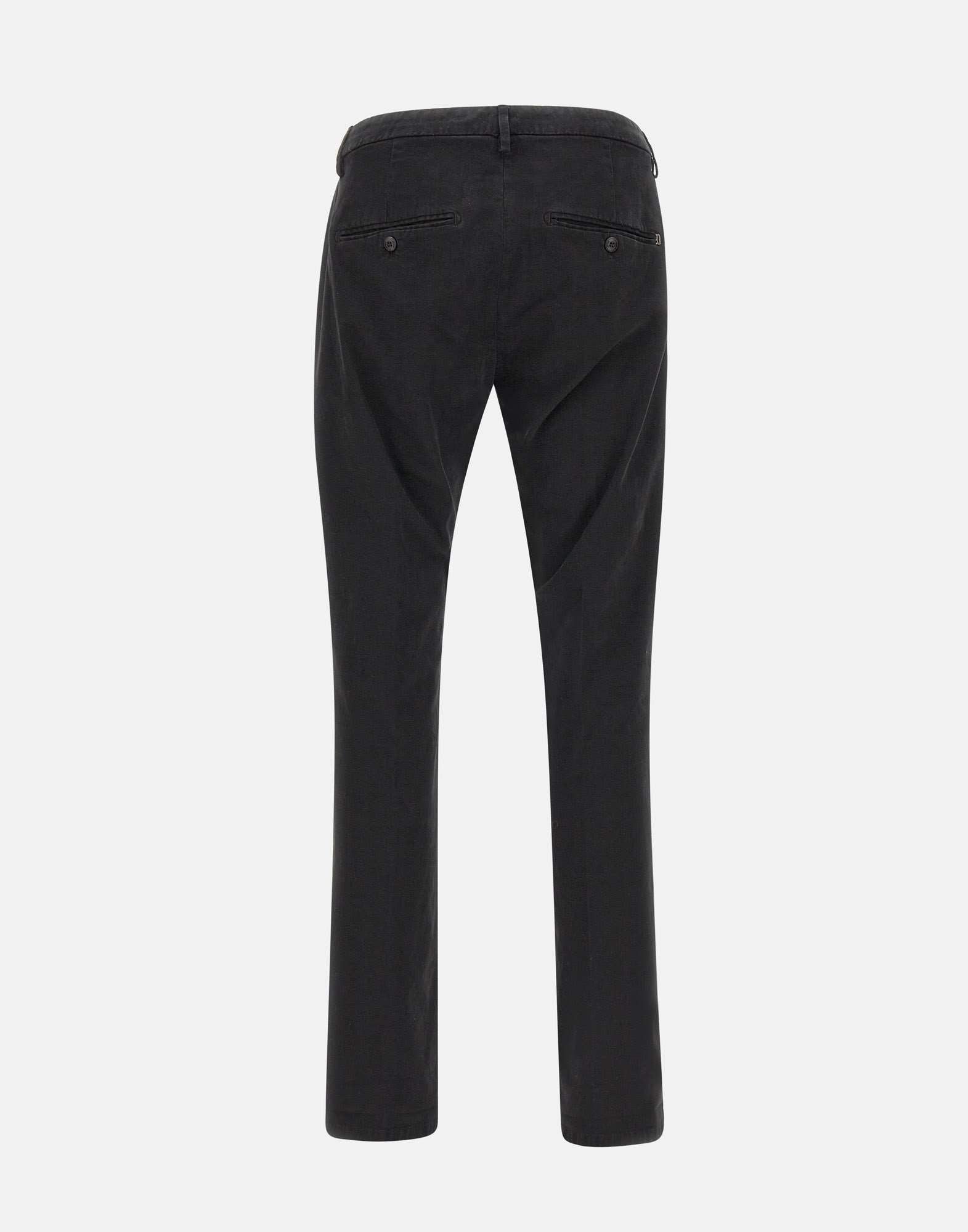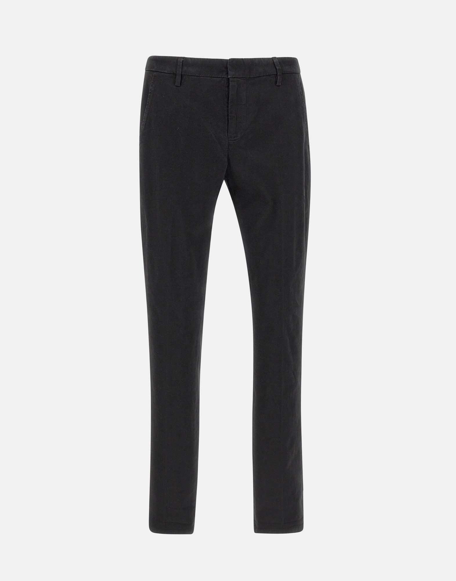 Black "Gaubert" men's trousers in stretch cotton from DonDup, super soft and comfortable peached fabric, side welt pockets, back pockets with button, zip and button fastening, waist with belt loops, straight leg, mini metal D logo on the back.