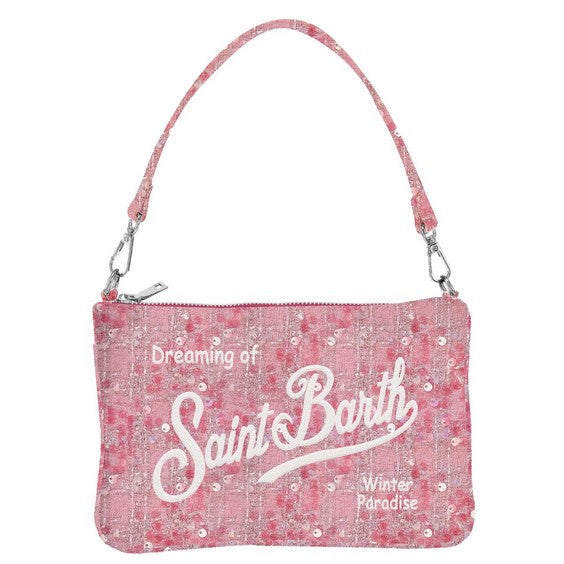 Pink Parisienne tweed and paillettes pouch from Mc2 St.Barth, lined interior, matching wrist strap and removable shoulder strap. Embroidered brand logo.