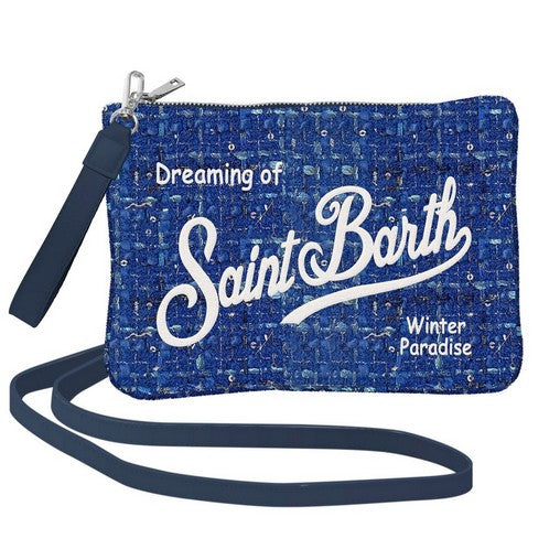 Bluette Parisienne tweed and lurex pouch from Mc2 St.Barth, lined interior, matching wrist strap and removable shoulder strap. Embroidered brand logo.