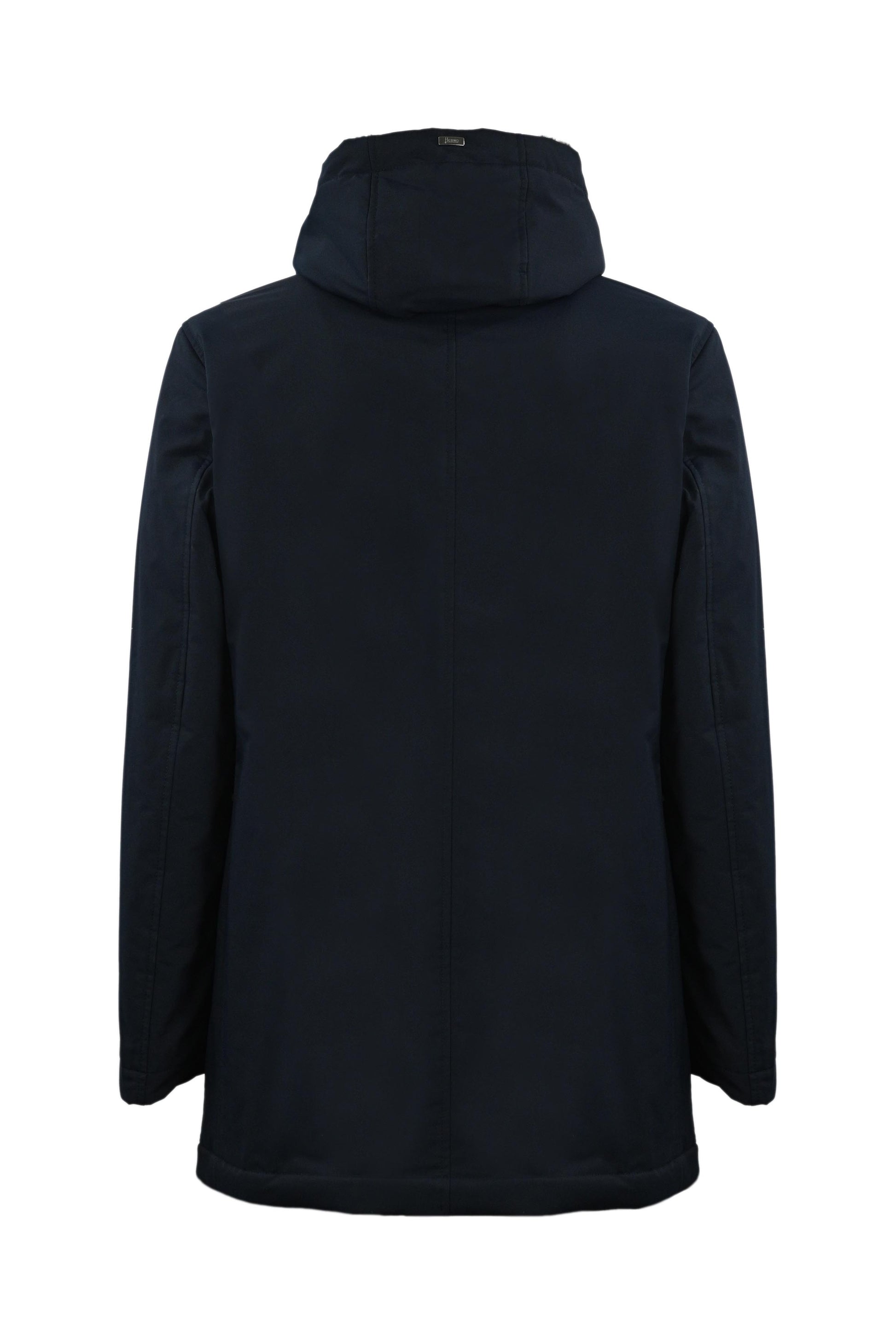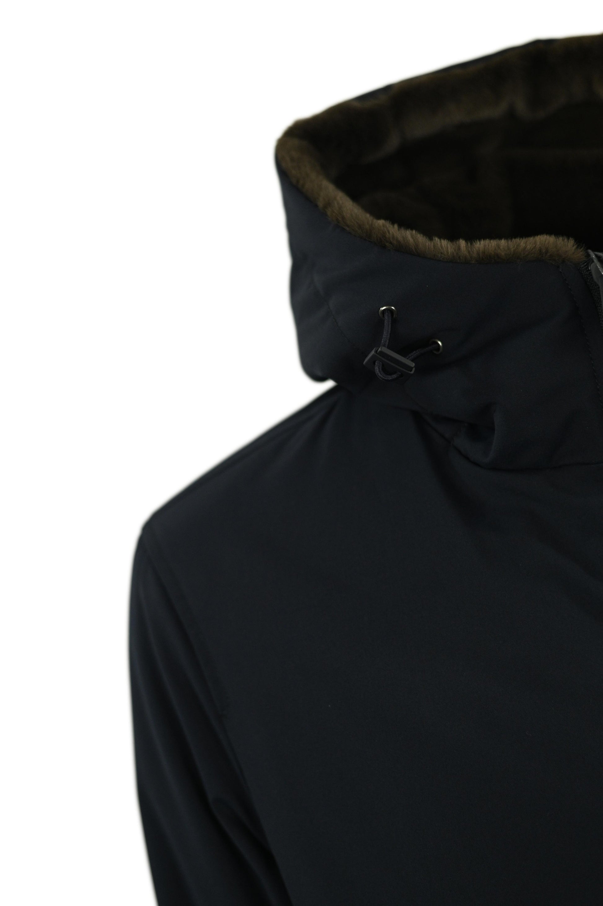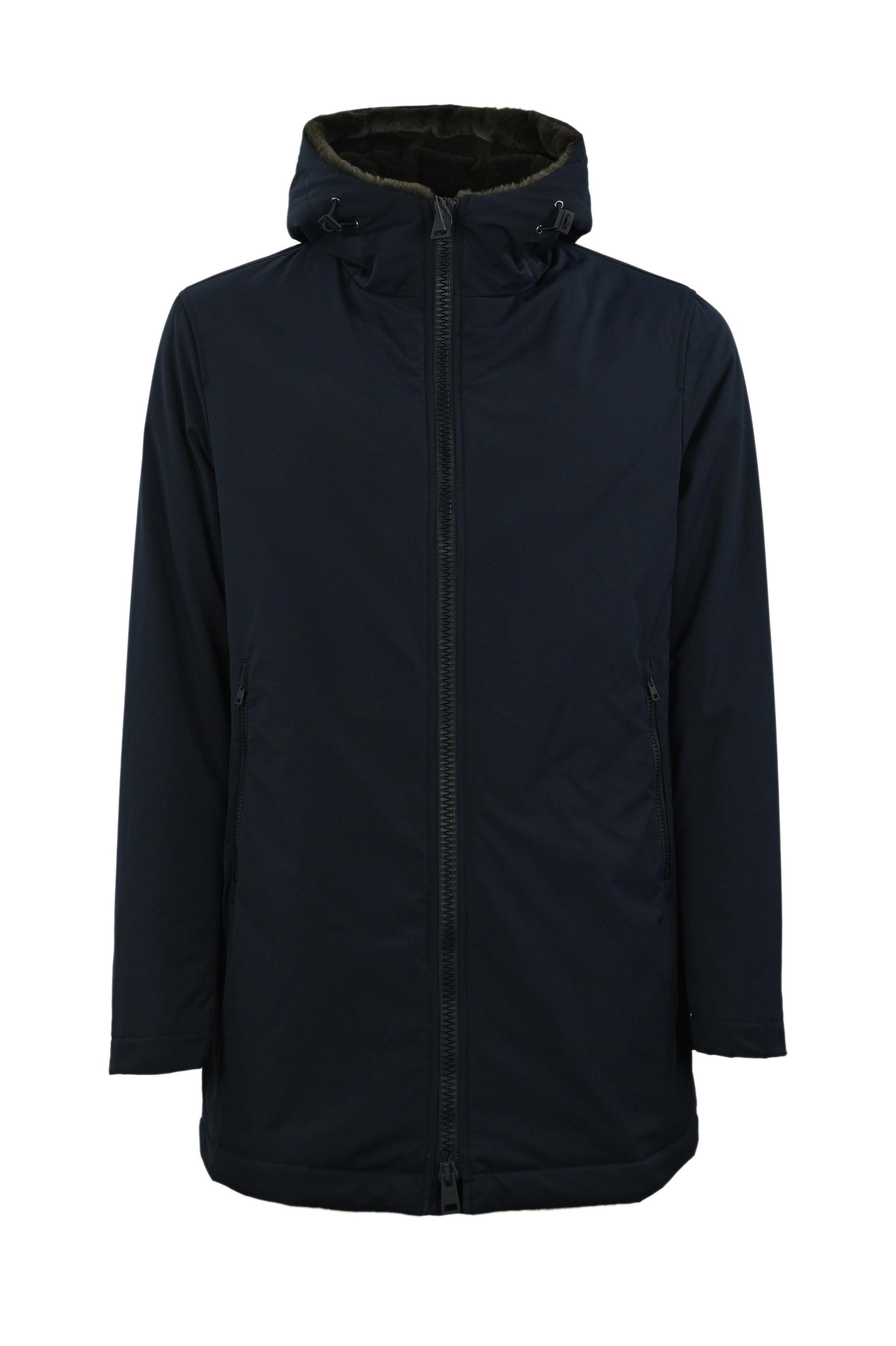 Navy parka with hood from Herno, eco fur inside,long sleeves,double slider zip closure and zipped pockets on the front.