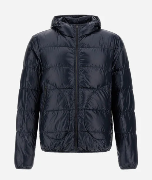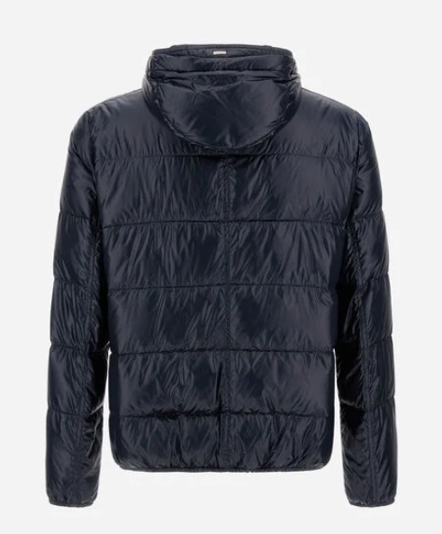 Blue jacket in Herno's iconic Ultralight Nylon, the most authentic expression of Herno style, with goose down padding, drawstring hood, zip pockets, metal Herno logo on the back, and zip closure.