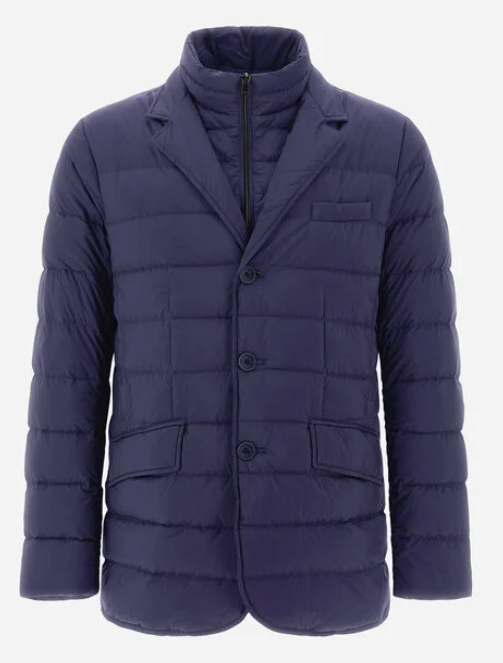 Blue Herno jacket in recycled nylon microfiber with a light coating on the reverse for a waterproof, soft-touch, and matte finish. It features a detachable windproof bib with a double-slider zip, button closure, down padding, and flap pockets.